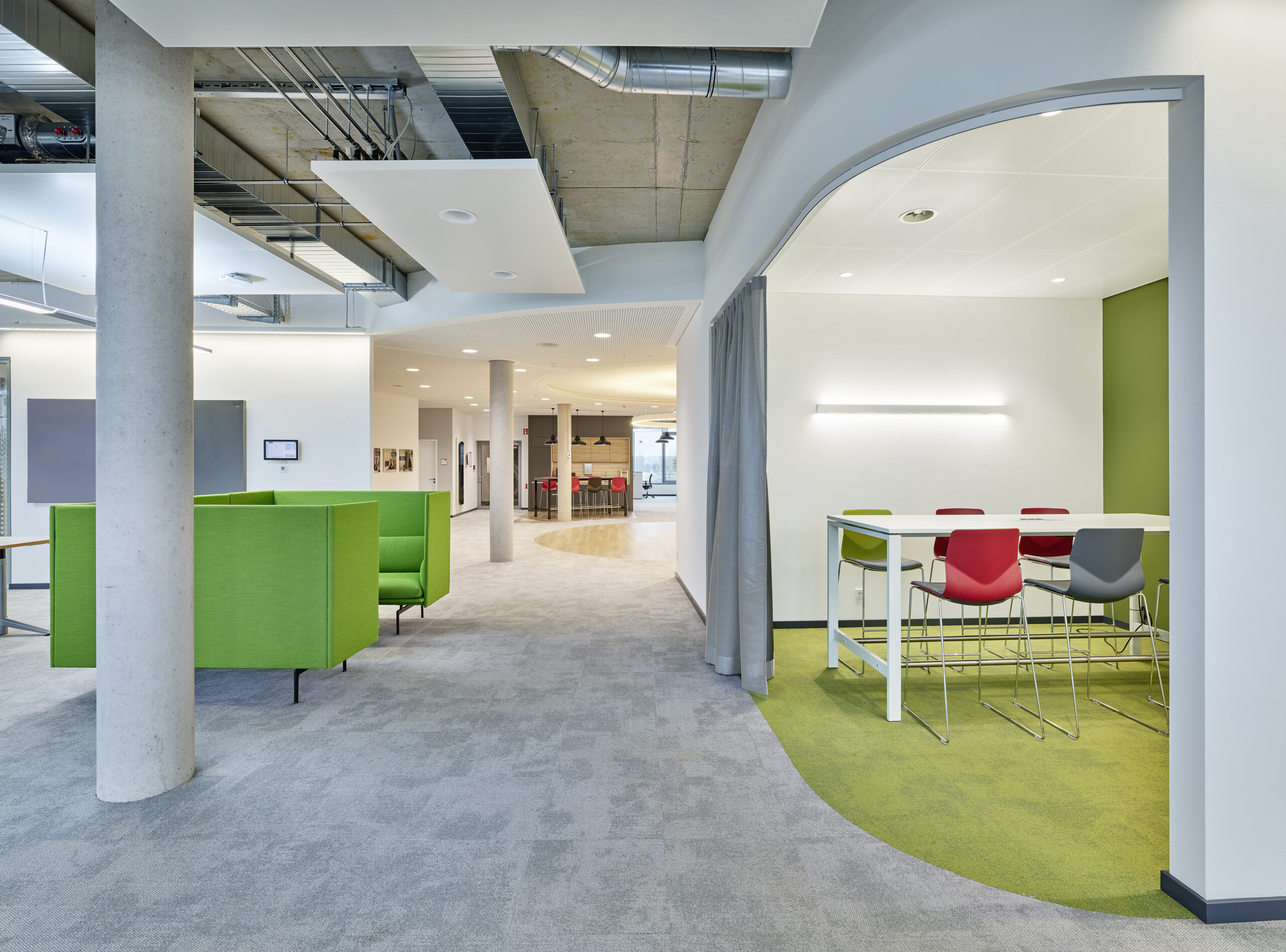 Sämtliche Bereiche des Gebäudes sind mechanisch be- und entlüftet und können über Heiz- und Kühldecken zu jeder Jahreszeit behaglich temperiert werden. Die Wärmeversorgung überwiegend erfolgt bivalent über eine Wärmepumpe/Kühlanlage. Für außergewöhnliche Spitzen ist zusätzlich ein Brennwertkessel vorhanden. Eine Photovoltaikanlage zur Eigenstromerzeugung wurde auf der Dachfläche aufgebracht.
